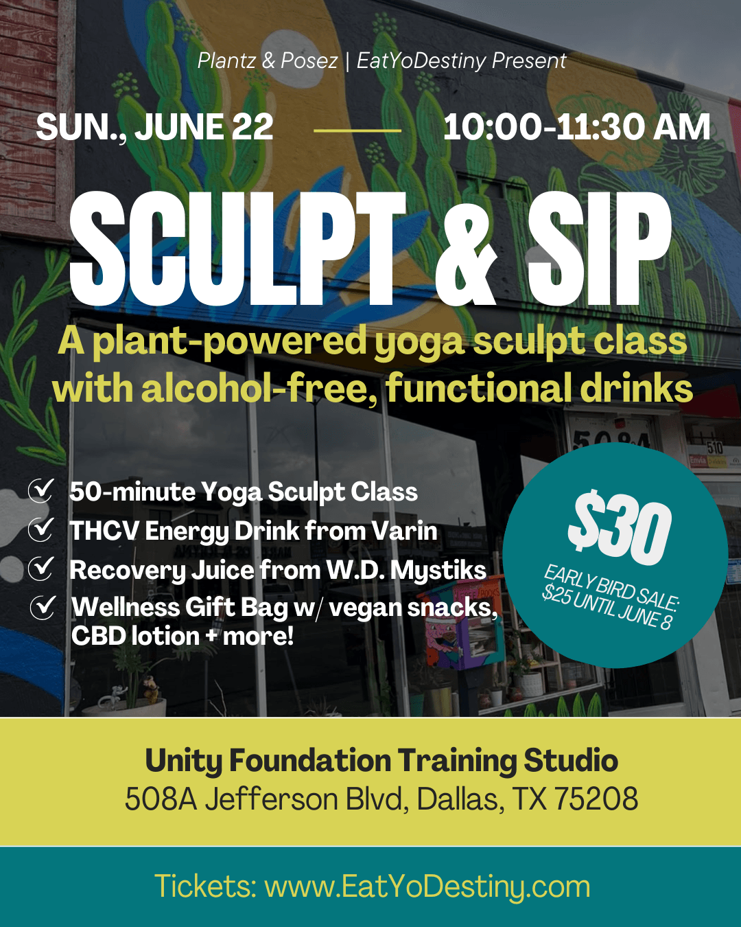 Sculpt & Sip is a plant-powered wellness experience combining a 50-minute Yoga Sculpt class with functional sips and feel-good community energy.