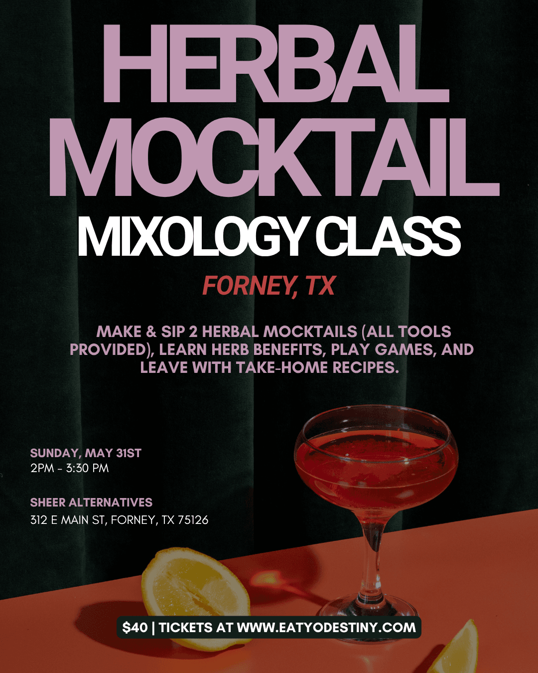 Join us on Sunday, May 31st @ 2PM for a hands-on herbal mocktail class at Sheer Alternatives- 312 E Main St, Forney, TX 75126