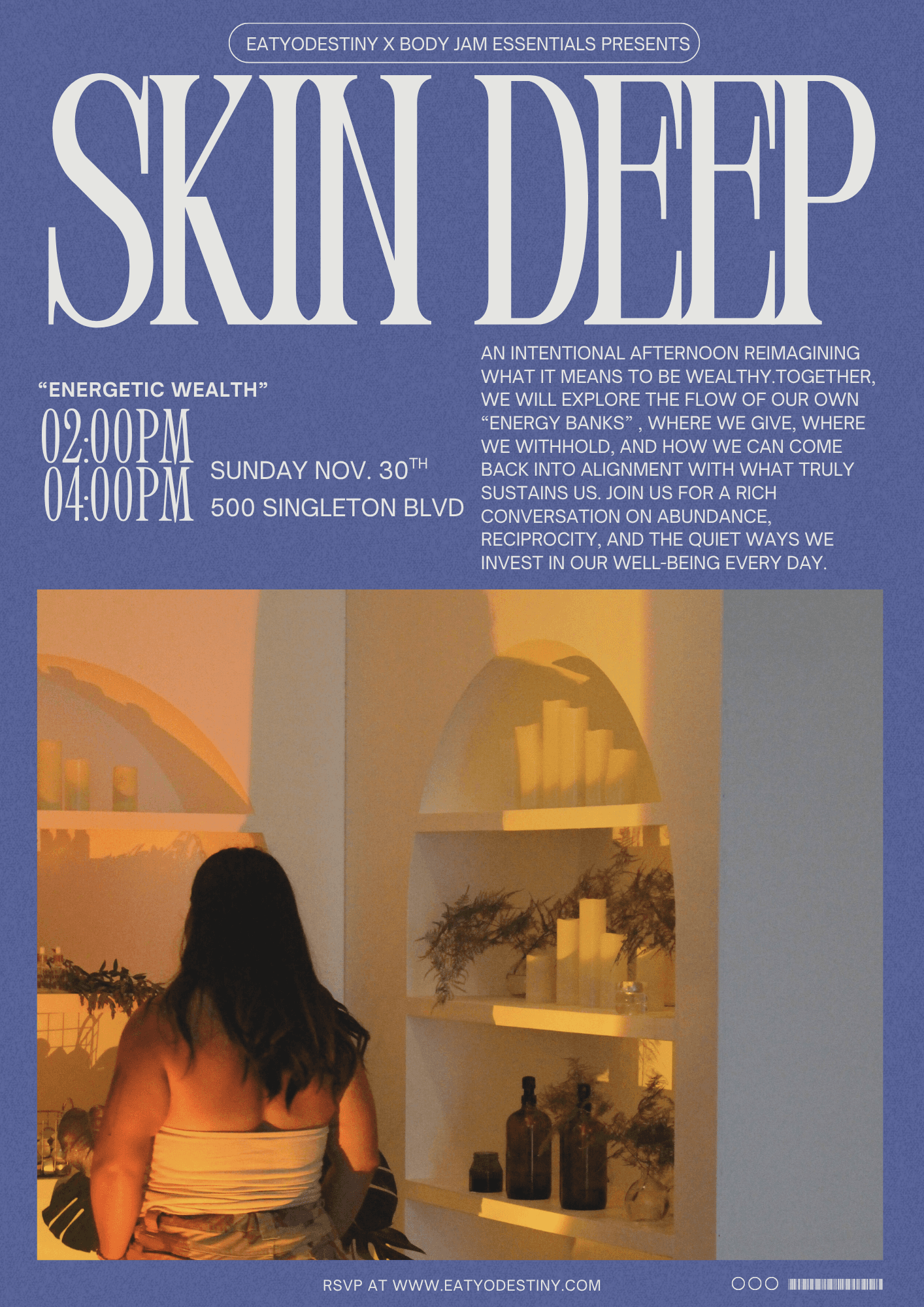 Join us for Skin Deep, an intentional Sunday afternoon reimagining what it means to be wealthy. Together, we will explore the flow of our own “energy banks”, where we give, where we withhold, and how we can come back into alignment with what truly sustains us. Join us for a rich conversation on abundance, reciprocity, and the quiet ways we invest in our well-being every day.